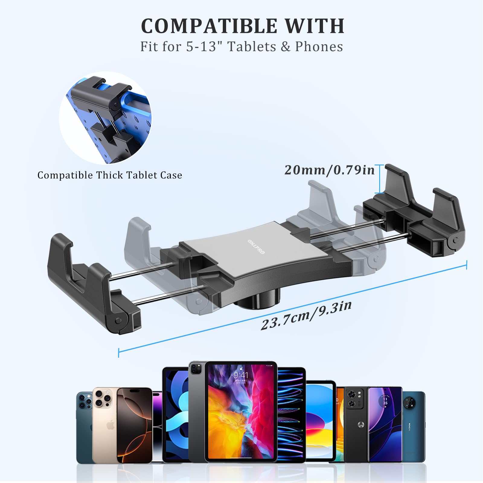 - 【Widely Compatible with 5-13” Devices】This ipad holder for car has a powerful clamping capacity that is compatible with a variety of tablets, mobile phones and e-readers from 5 to 13 inches. Whether it is an iPad, Samsung tablet, Kindle or a large-screen mobile phone, it can be securely and firmly fixed.