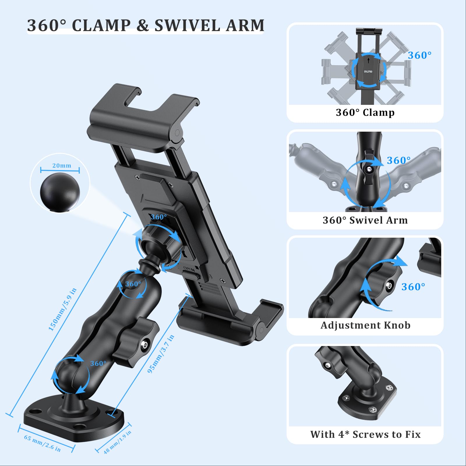• 【Simple Operation】Our ipad mount for truck offers easy installation on all smooth surfaces, tablet holder base has 4 holes for semi-permanent installation with screws (we provide screws) suitable for any car. Important: Use caution and consult a mobile install professional to avoid drilling into any highly sensitive components.