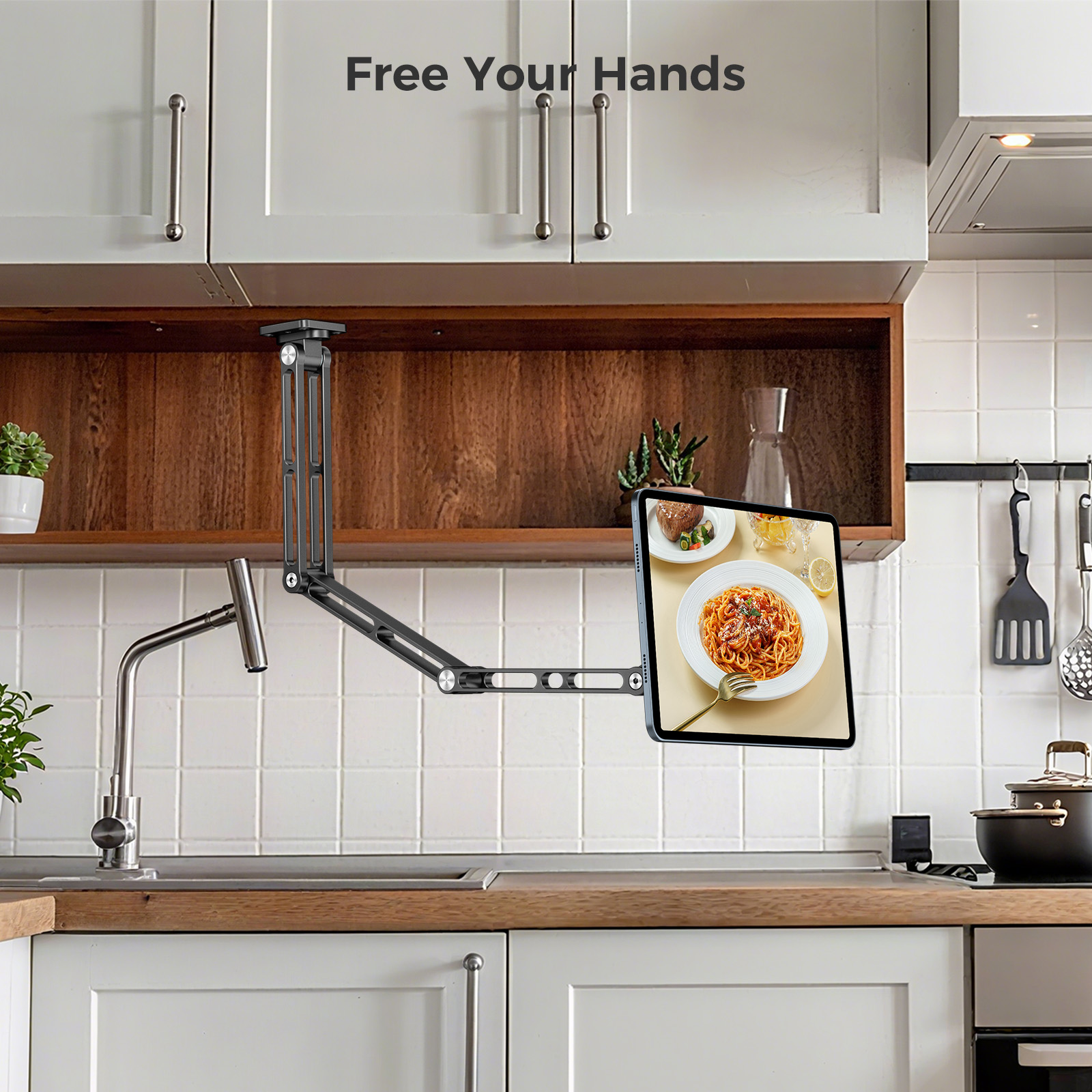 Features a 20mm ball head and a 3-section extendable arm for 360° adjustment in portrait or landscape. When not in use, the arm folds flat against the wall—ideal for kitchens, offices, and bedrooms.