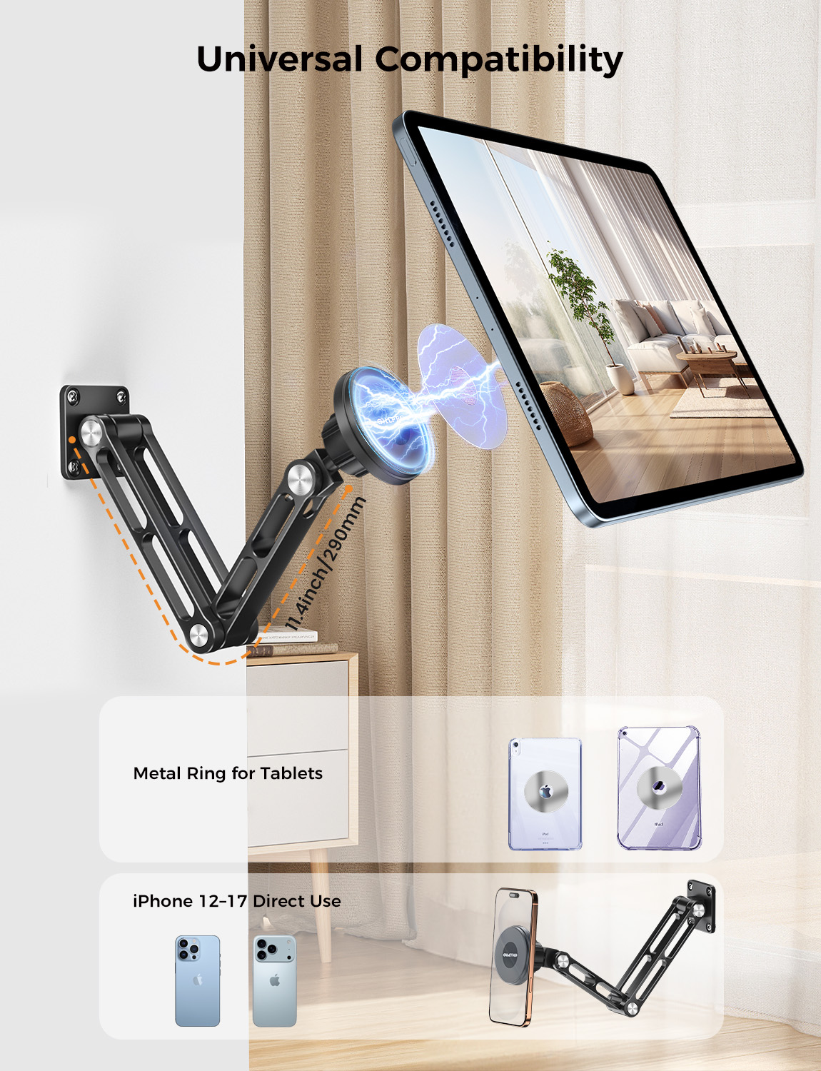 • 【Wide compatibility】The ipad magnetic wall mount compatible with tablets/iPad Pro/Air/Mini, MagSafe iPhone 12-17 series,Galaxy Tab and other tablets and mobile phones, one set of brackets can meet the hanging needs of different devices for the whole family.(Kind tips:Non-MagSafe devices must use the included metal ring for magnetic compatibility, ensure the surface is clean, smooth, and grease-free. For the best performance, allow 24 hours after attaching the metal ring before mounting the device.)