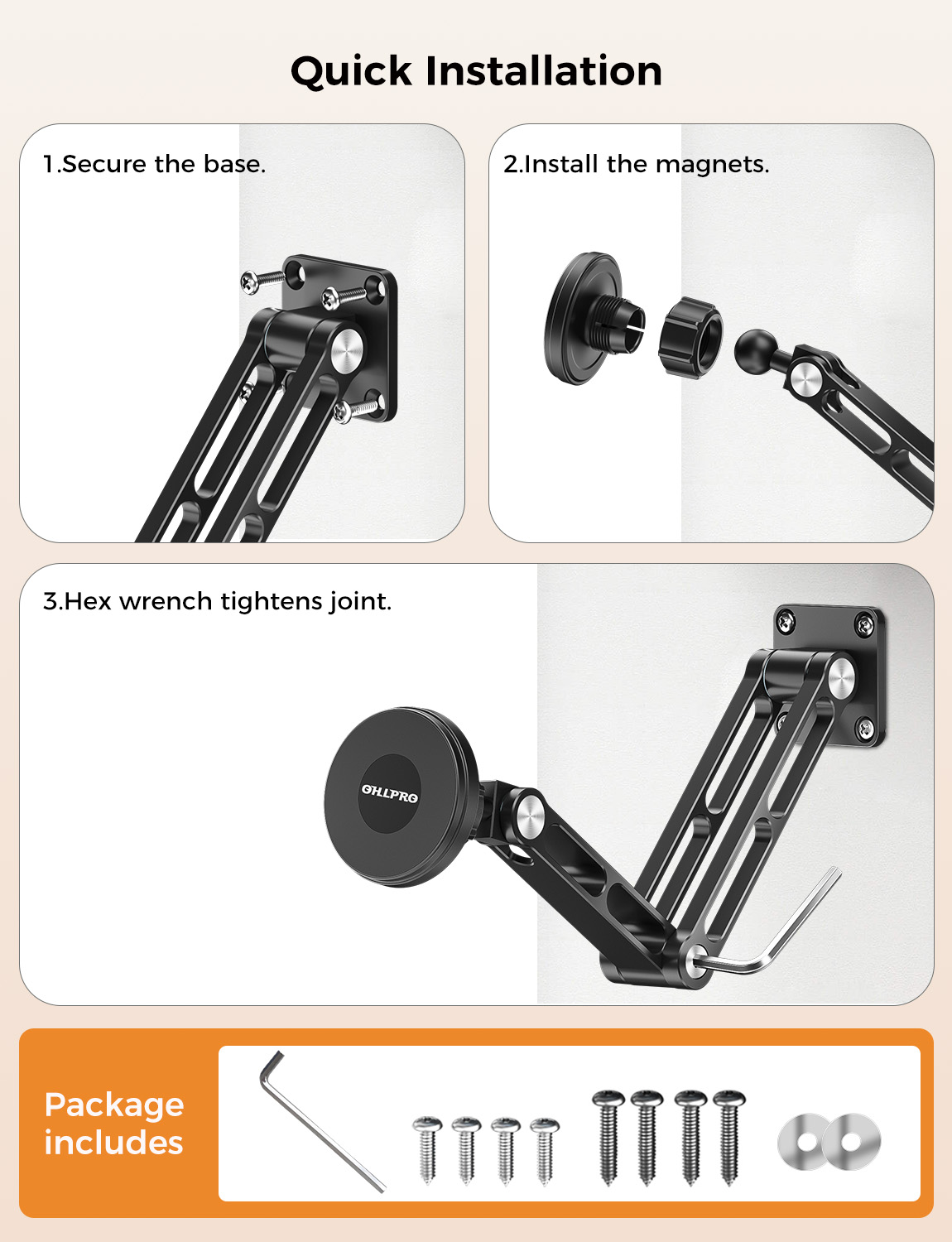 • 【2-Stage Adjustable Aluminum Alloy Arm】This tablet wall mount holder has 2-stage aluminum alloy folding extension arm, which can freely adjust the length and angle, and can easily stretch and fold forward and backward, perfectly adapting to various viewing distances and angles. The magnetic iPad wall mount can be folded against the wall when not in use to save space.