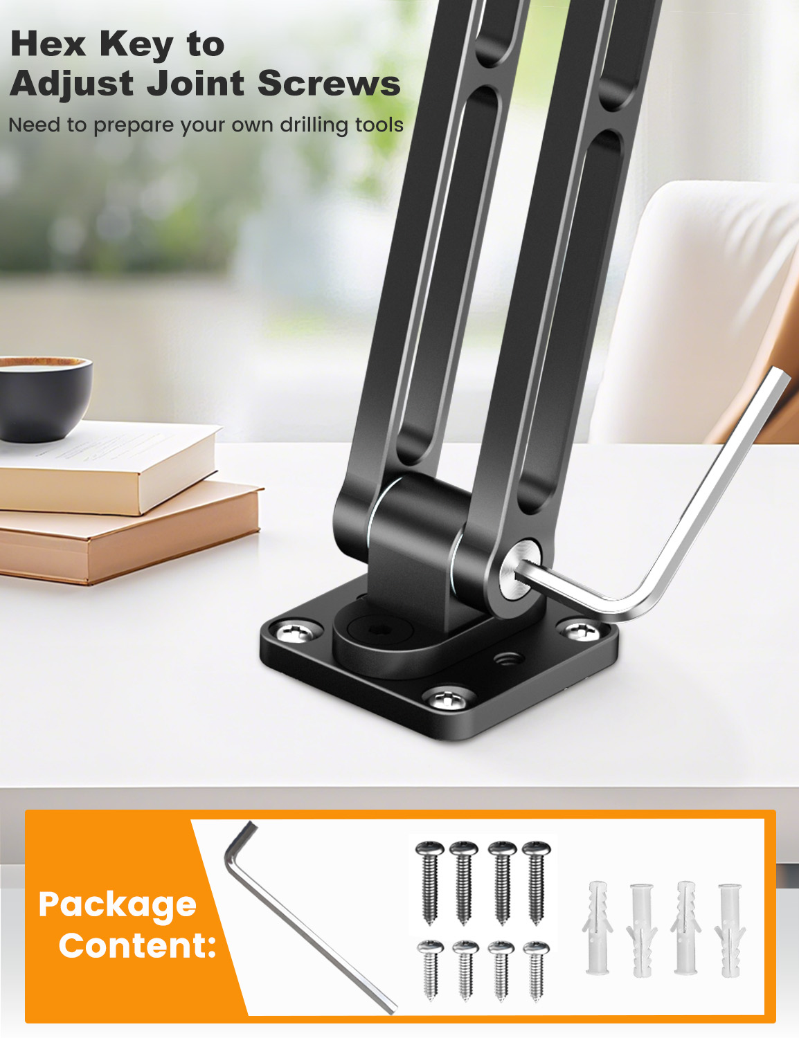 Includes four long and four short M5 screws, wall plugs, and a hex key for versatile mounting. Saves space in kitchens, offices, bathrooms, and workstations. A drill is required for installation.