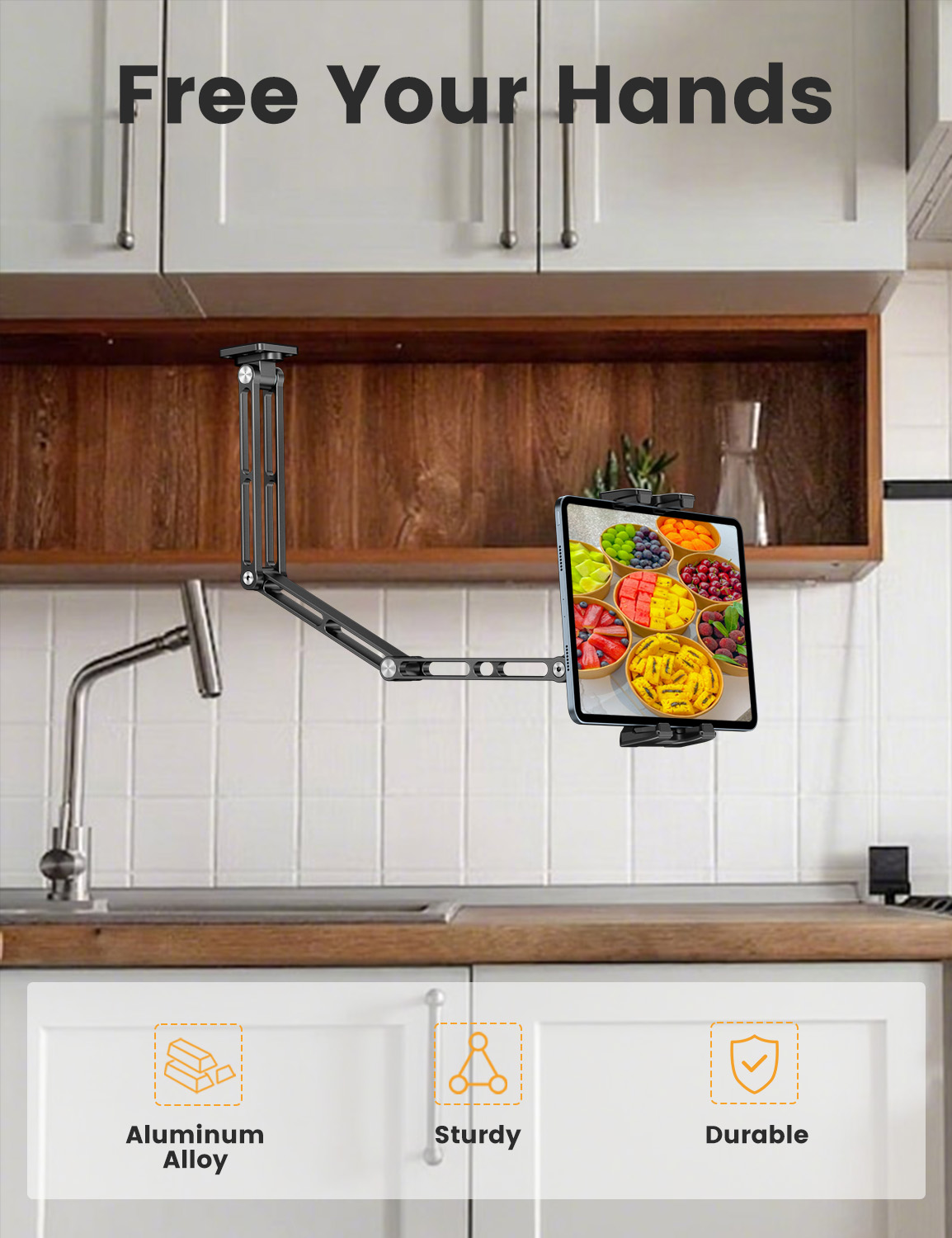Built from durable aluminum alloy with a three-stage retractable arm that extends up to 23.6 inches (60 cm). Provides stable, reliable support for your tablet in any position. Use the included hex key to lock joints for added stability.