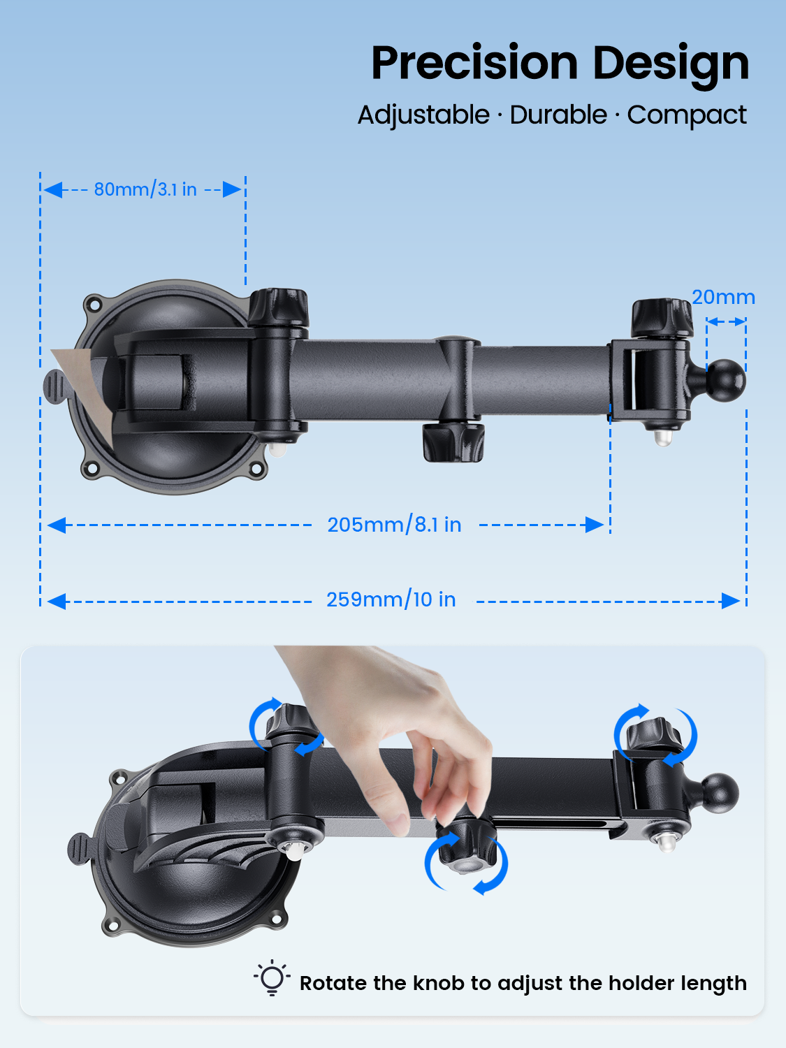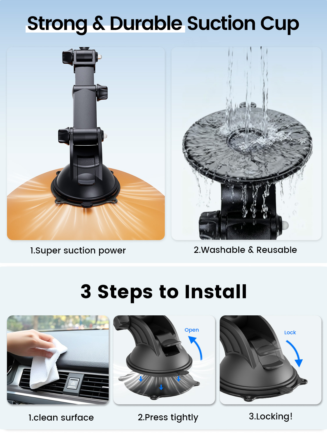 • 【Washable & Reusable Suction Cup】Made from durable matte black plastic, this suction cup tablet mount can be rinsed with water and reused multiple times without losing grip. The strong gel base keeps a solid hold on glass or dashboards — an ideal iPad car holder mount for daily driving or home use.