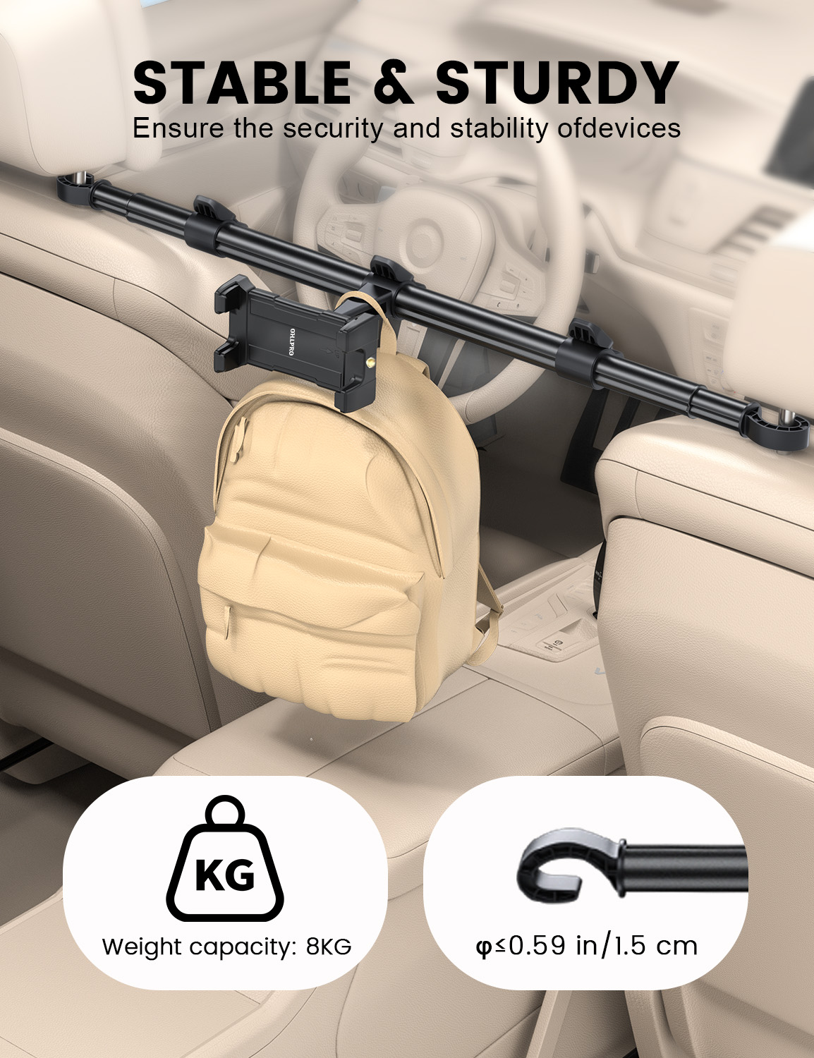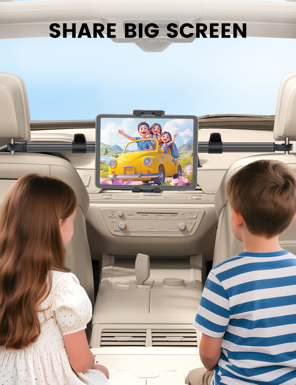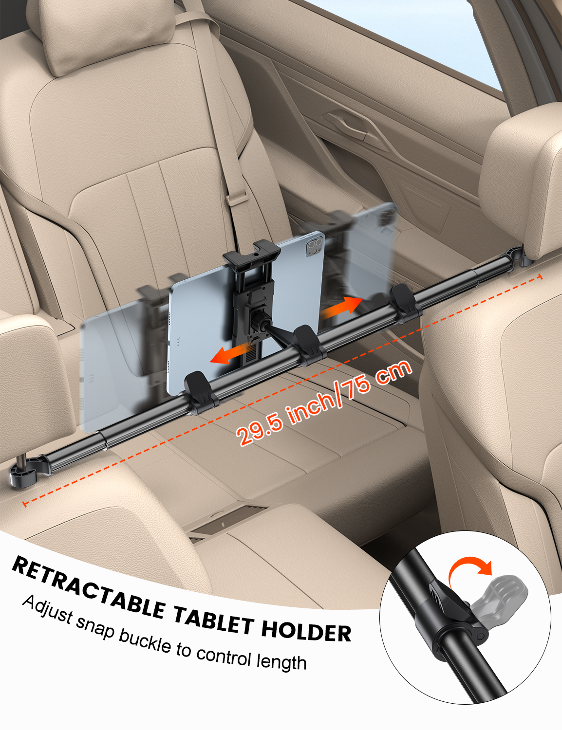 Featuring a 3-stage telescoping arm, this holder extends from 15” to 27.5” (38–70 cm), allowing you to position the tablet perfectly for backseat viewers. Tip: Measure your headrest spacing before purchase for the best fit.