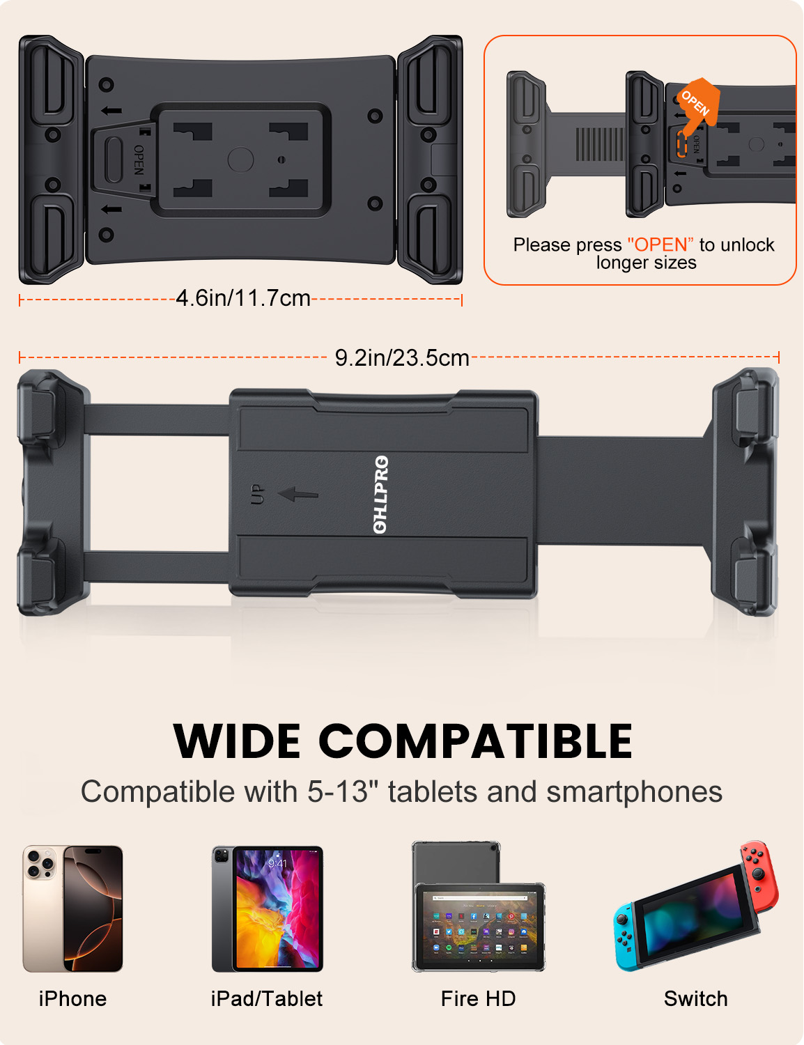 Fits most tablets and large phones (diagonal screen size 5–13”, max thickness 0.78” / 20 mm). Works with iPad Pro/Air/Mini, iPhone 16–11, Galaxy Tab S10/S9, Kindle Fire, and similar devices.