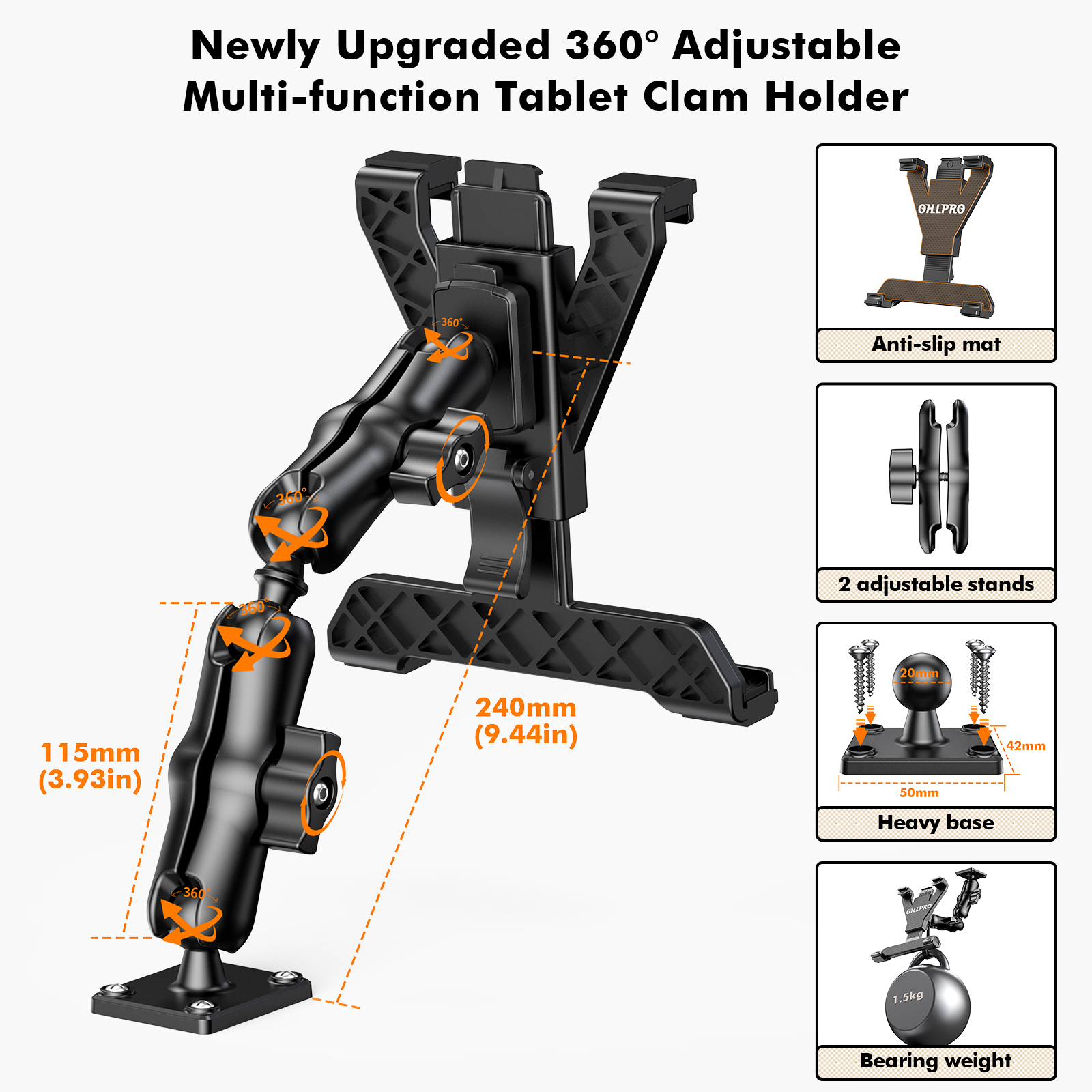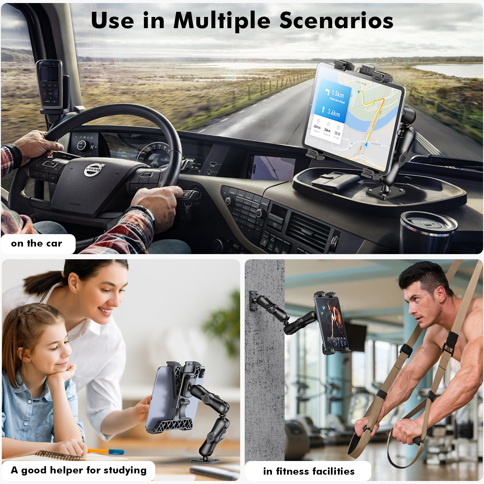 - 【Sturdy Tablet Holder】iPad mount car tablet holder with ball joints on both ends for 360° rotation. The 2-section extension arm can adjust the height and navigation angle, is not easy to break, and can withstand the harsh test of potholes, making it a perfect truck accessory.